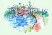 A wetland landscape, quay-side deck areas and rustic, riverside